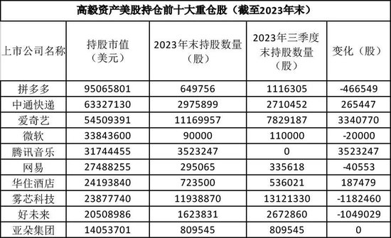 数据显示,截至去年四季度末,高毅资产美股持仓中的前十大重仓股分别为拼多多、中通快递、爱奇艺、微软、腾讯音乐、网易、华住酒店、雾芯科技、好未来和亚朵集团。相比于去年三季度末,腾讯音乐新进前十大重仓股名单。