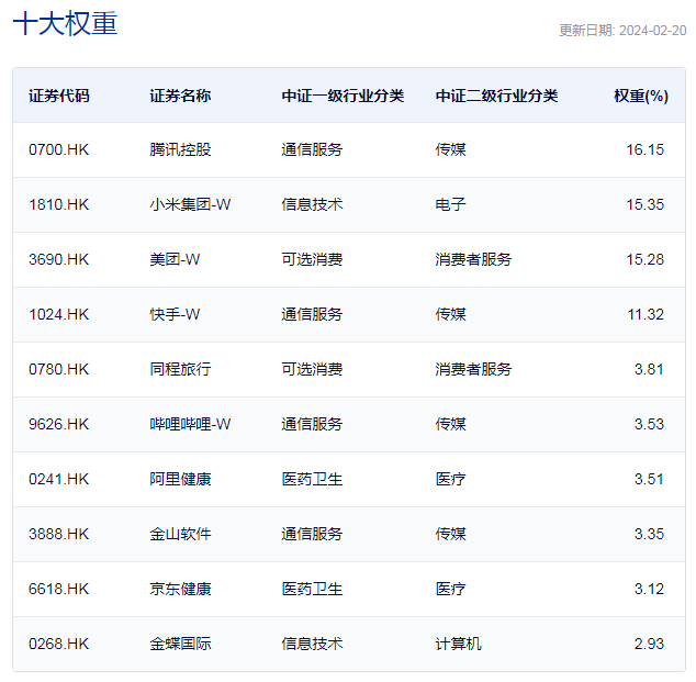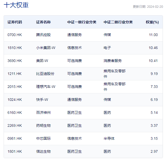 中证港股通科技指数(指数代码:931573.CSI,指数简称:HKC科技)是中证指数有限公司于2014年12月31日发布的指数,基日为2014年5月21日。其是从港股通范围内选取50只市值较大、研发投入较高且营收增速较好的科技龙头上市公司证券作为指数样本,以反映港股通内科技龙头上市公司证券的整体表现。按恒生一级行业划分,资讯科技业(HS)、医疗保健业(HS)、非必需性消费(HS)的权重占比最高。该指数前十大权重股第一主营业务分布广泛,涵盖外卖业务、增值服务、智能手机收入、线上销售服务、医药和健康产品销售等多个互联网行业细分领域。总的来看,指数成份行业科技创新属性突出,技术要求较高且发展较快。