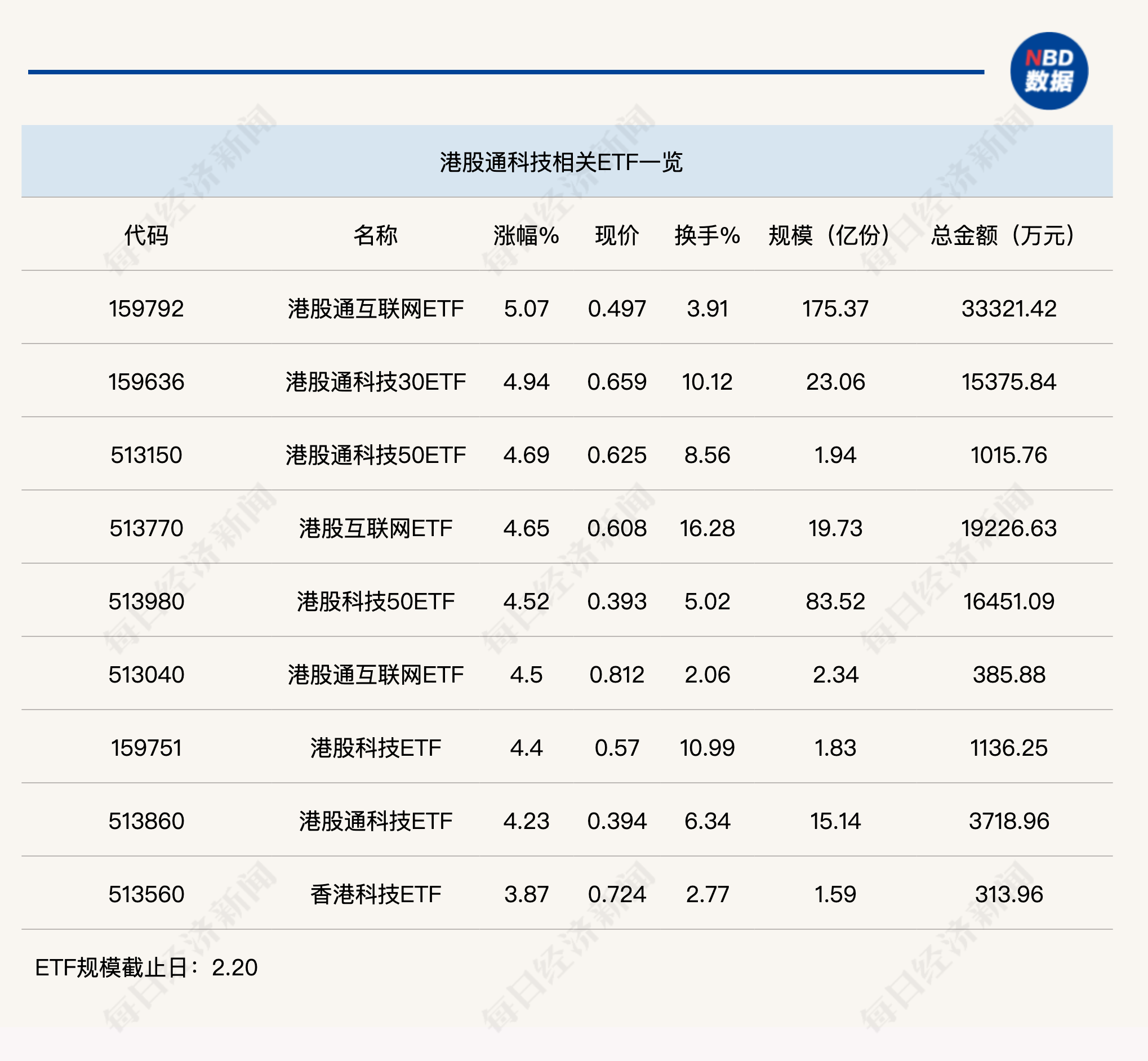 点评:港股通科技50ETF(513150)和港股科技50ETF(513980)今日上午分别上涨4.69%和4.52%。其中,港股科技50ETF(513980)规模较大,达到83.52亿份,半日成交金额为1.65亿元。这两只ETF均追踪的是中证港股通科技指数,追踪该指数的ETF还包括港股科技ETF(159751)、港股通科技ETF(513860)以及香港科技ETF(513560)。