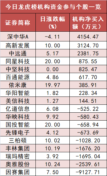 盘后龙虎榜数据显示,机构现身18股,其中深中华A等9股现机构资金净买入,因赛集团等9股呈现机构资金净卖出。