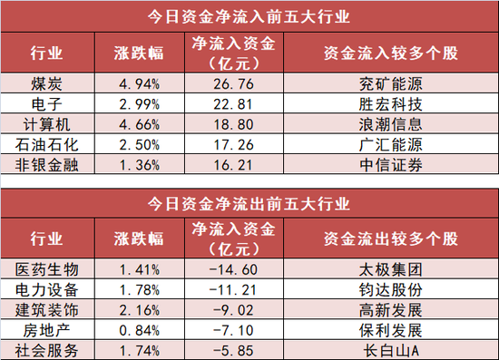 申万一级行业中,17个行业实现资金净流入,其中煤炭行业净流入26.76亿元居首。