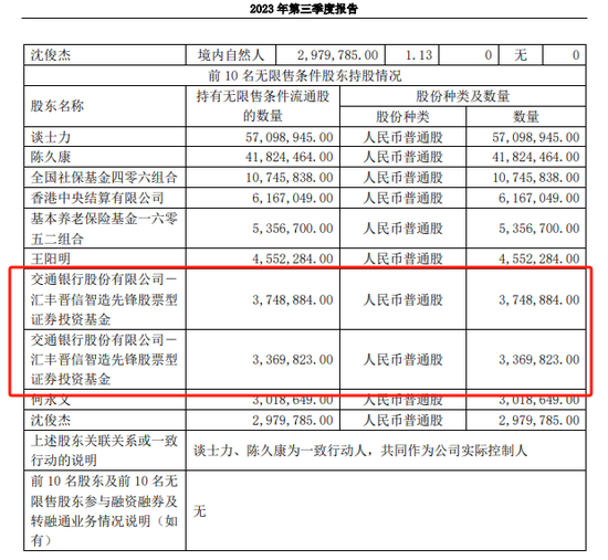 需指出的是,克来机电在2023年第三季度的前十大流通股东持股统计中,汇丰晋信智造先锋曾两次出现在股东名称序列,且持股数量不同。记者从克来机电了解获悉,真实的持股数量为第七名,截止到2023年三季度末持有374.88万股,另一同名披露信息有误,为南方阿尔法混合持股数量。