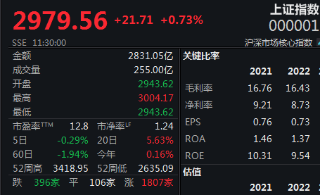 今日A股低开后快速反弹,创业板指、科创50一度涨逾3%,午前各大指数均出现一定回落,截至上午收盘,上证指数涨0.73%报2979.56点,深证成指涨1.65%报9196.71点,创业板指涨1.79%报1780.22点,科创50指数涨2.35%报789.76点,北证50指数涨1.07%。市场半日成交额6746.3亿元,北向资金实际净买入126.98亿元。