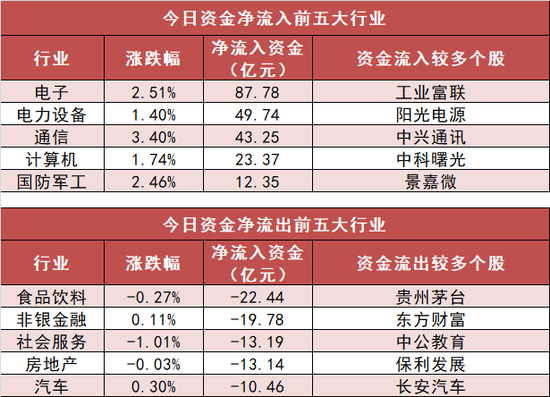 申万一级行业中,13个行业实现资金净流入,其中电子行业净流入87.78亿元居首。