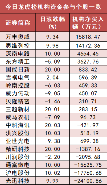 盘后龙虎榜数据显示,机构现身19股,其中万丰奥威等11股现机构资金净买入,光迅科技等8股现机构资金净卖出。