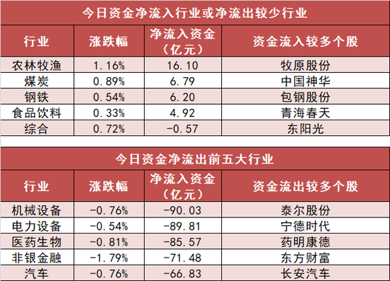 申万一级行业中,4个行业实现资金净流入,其中农林牧渔行业净流入16.1亿元居首。