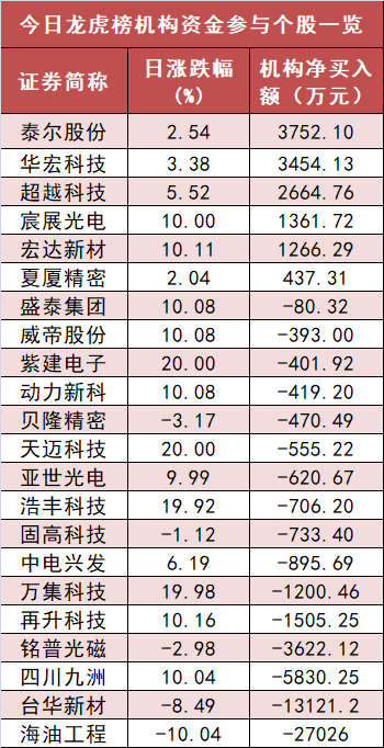 盘后龙虎榜数据显示,机构现身22股,其中泰尔股份等6股现机构资金净买入,海油工程等16股呈现机构资金净卖出。