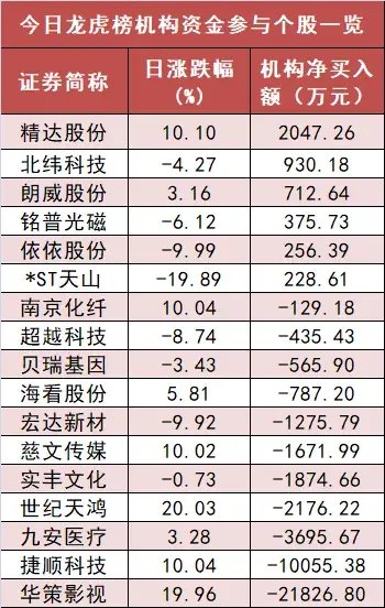盘后龙虎榜数据显示,机构现身17股,其中精达股份等6股现机构资金净买入,华策影视等11股呈现机构资金净卖出。