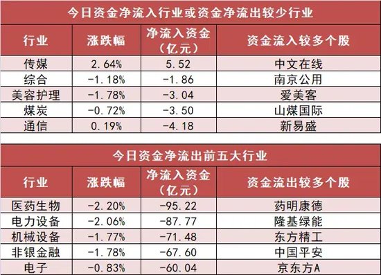 申万一级行业中,医药生物、电力设备、机械设备、非银金融等行业资金净流出规模居前,其中医药生物行业净流出95.22亿元居首。