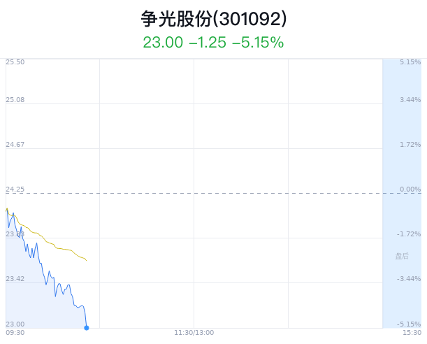 04月10日,争光股份(301092)股价大幅下跌,截至10点21分,争光股份下跌5.15%,报23.00元/股,成交2694万元,换手率2.66%,振幅5.15%。