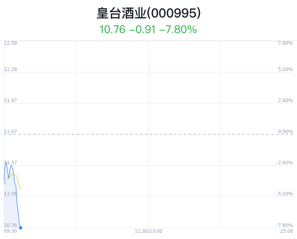 04月15日,皇台酒业(000995)股价大幅下跌,截至09点40分,皇台酒业下跌5.14%,报11.07元/股,创近1月新低,成交1020万元,换手率0.51%。