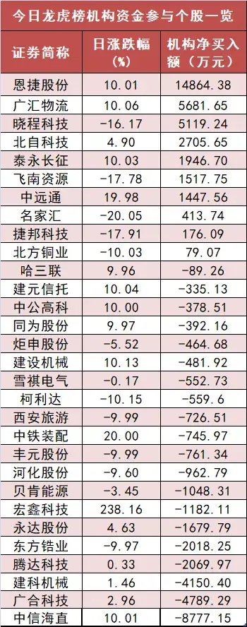 盘后龙虎榜数据显示,机构现身30股,其中恩捷股份等10股现机构资金净买入,中信海直等20股呈现机构资金净卖出。