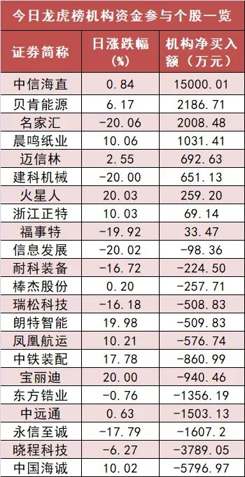 盘后龙虎榜数据显示,机构现身22股,其中,中信海直等9股现机构资金净买入,中国海诚等13股呈现机构资金净卖出。