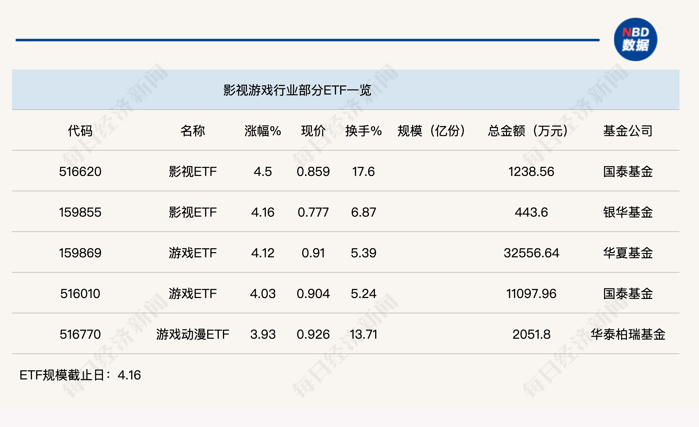 点评:游戏ETF(159869)和游戏ETF(516010)今日上午也分别上涨4.12%和4.03%。其中,游戏ETF(159869)规模较大,达到67.26亿份,该ETF半日成交金额达到3.26亿元。上述两只ETF追踪的是中证动漫游戏指数。追踪该指数的ETF还有游戏动漫ETF(516770)。