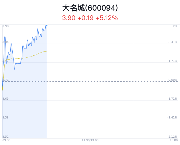 04月18日,大名城(600094)股价大幅上涨,截至10点30分,大名城上涨5.12%,报3.90元/股,成交7313万元,换手率0.84%。