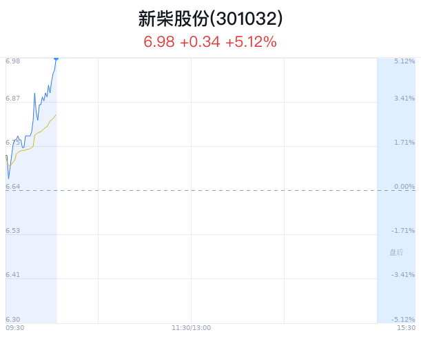 04月23日,新柴股份(301032)股价大幅上涨,截至10点02分,新柴股份上涨5.12%,报6.98元/股,成交1106万元,换手率1.96%。