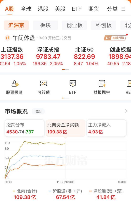 “五一”假期利好频出,助攻市场行情。5月6日,节后首个交易日,A股主要指数集体飘红。截至上午收盘,沪指涨1.05%,深成指涨2.05%,创业板指涨2.18%。北向资金大举净买额109.38亿元。