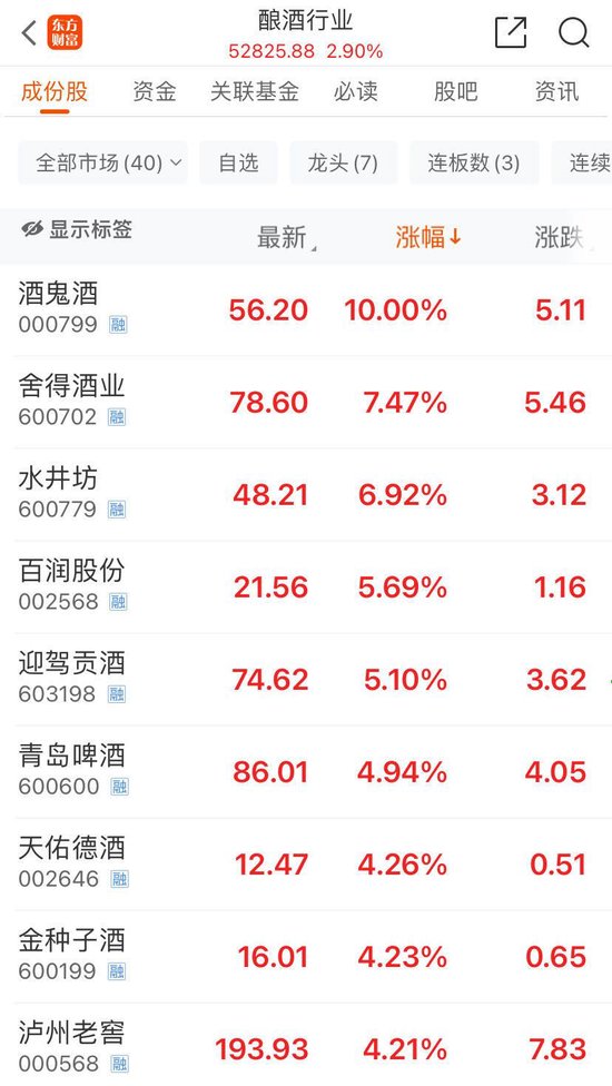 酒类股6日盘中发力走高,截至上午收盘,酒鬼酒涨停,舍得酒业涨近7.5%,水井坊涨近7%,百润股份、迎驾贡酒等涨超5%,五粮液涨近3%,贵州茅台涨近3%。