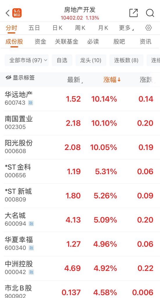 近期房地产板块持续迎来利好消息,个股表现踊跃。5月6日上午,地产股开盘走高,南国置业五连板,华远地产、阳光股份等多股涨停。