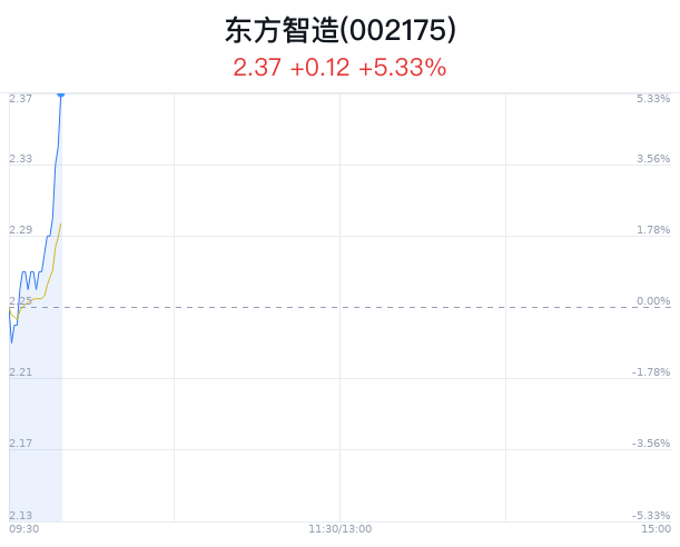 05月07日,东方智造(002175)股价大幅上涨,截至09点48分,东方智造上涨5.33%,报2.37元/股,成交2131万元,换手率0.73%,振幅6.22%。