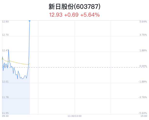 05月10日,新日股份(603787)股价大幅上涨,截至10点15分,新日股份上涨5.64%,报12.93元/股,创近4月新高,成交1.67亿元,换手率5.90%,振幅7.35%。