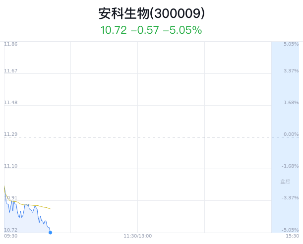 05月10日,安科生物(300009)股价大幅下跌,截至10点12分,安科生物下跌5.05%,报10.72元/股,成交3.65亿元,换手率2.76%。
