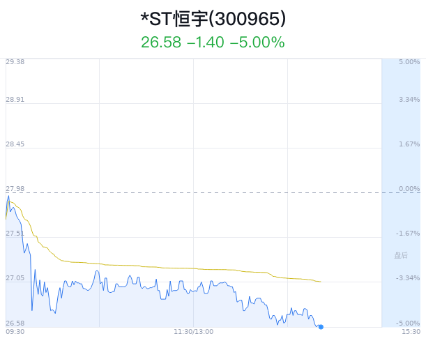 05月10日,*ST恒宇(300965)股价大幅下跌,截至14点21分,*ST恒宇下跌5.00%,报26.58元/股,成交2671万元,换手率6.01%。