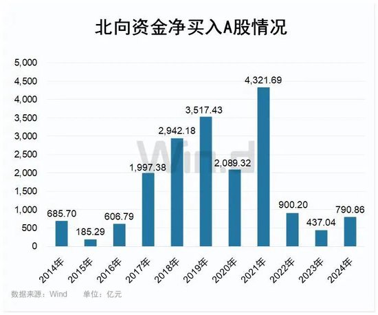 在2021年达到顶峰4321.69亿后有所回落,不过今年有望再度放大。截至目前5月11日,北向资金今年已净流入790.86亿元,超过去年全年。