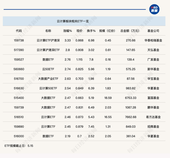 点评:数据ETF(159527)半日涨幅也有2.76%,不过其规模较小,只有0.16亿份,其追踪的是中证云计算与大数据主题指数。追踪该指数的ETF还有包括云计算ETF(516510)、云计算50ETF(516630)等。其中,云计算ETF(516510)规模较大,达到16.55亿份,半日成交金额为7663万元。