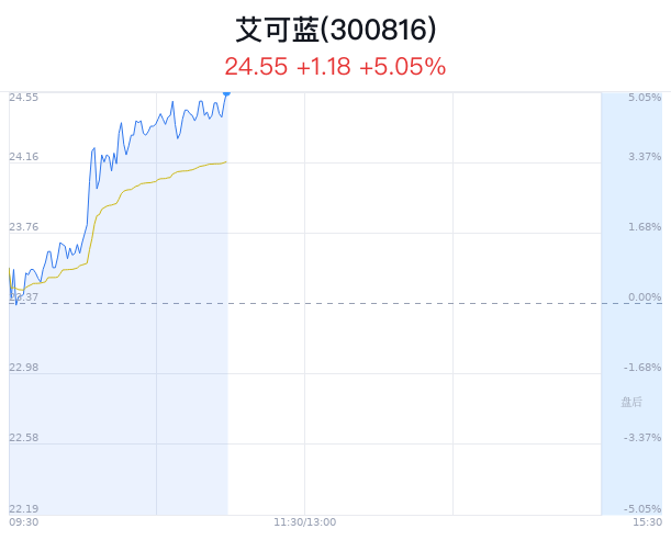 05月17日,艾可蓝(300816)股价大幅上涨,截至10点58分,艾可蓝上涨5.05%,报24.55元/股,创近4月新高,成交2559万元,换手率2.19%,振幅5.22%。