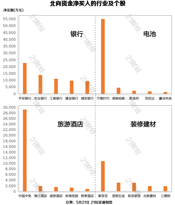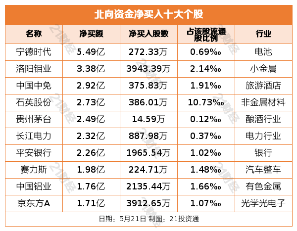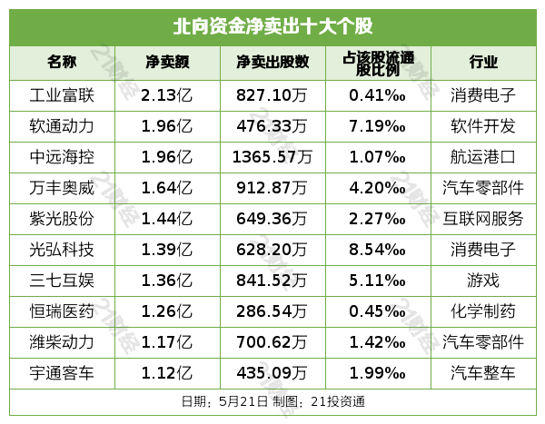 据21投资通智能监测,5月21日,北向资金净卖出19.67亿元,其中沪股通净买入3.35亿元,深股通净卖出23.02亿元。