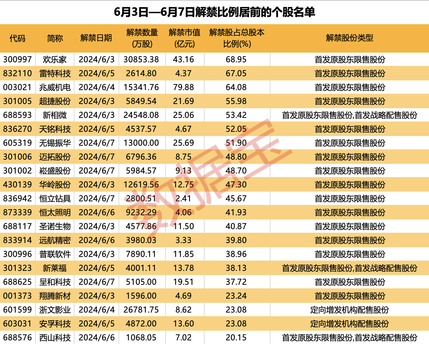 e公司讯,据证券时报·数据宝统计,下周(6月3日至7日),A股市场将有70家上市公司迎来限售股解禁。以个股最新价计算,解禁股对应市值合计489.35亿元。从规模上看,兆威机电、士兰微、欢乐家解禁市值排名前三,依次为79.88亿元、46.6亿元、43.16亿元,兆威机电为A股微型传动系统龙头;另有无锡振华、新相微、中国稀土、超捷股份等4股解禁市值在20亿元以上。在上述个股中,除了士兰微和中国稀土的解禁股份类型为定向增发机构配售股份,其余5股均为首发原股东限售股份,其中新相微还包含了部分首发战略配售股份。