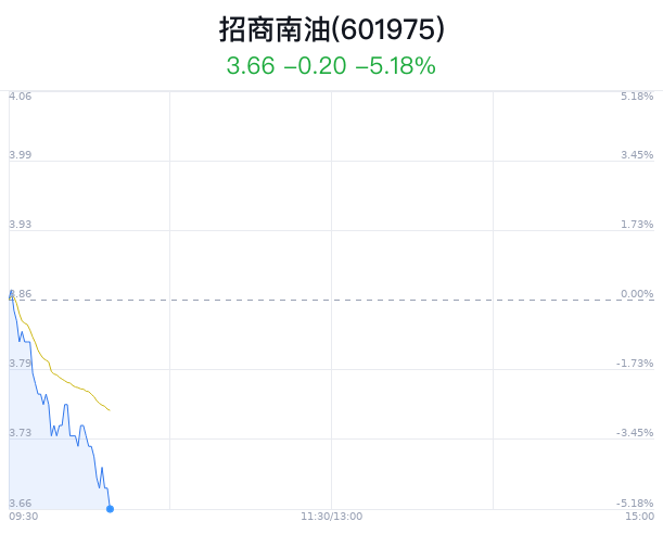 06月11日,招商南油(601975)股价大幅下跌,截至10点07分,招商南油下跌5.18%,报3.66元/股,创近1月新低,成交1.82亿元,换手率1.01%。