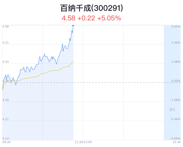 06月12日,百纳千成(300291)股价大幅上涨,截至11点15分,百纳千成上涨5.05%,报4.58元/股,成交5167万元,换手率1.25%。