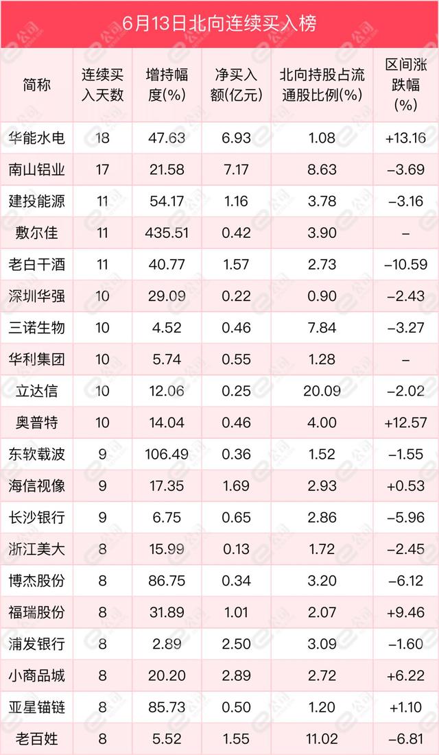 从连续买卖来看,华能水电、南山铝业、建投能源获北向资金连续净买入天数居前,分别为18天、17天、11天,期间净买入额分别为6.93亿元、7.17亿元、1.16亿元,期间增持幅度分别为47.63%、21.58%、54.17%。