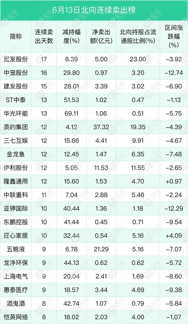 宏发股份、中宠股份、建发股份遭北向资金连续净卖出天数居前,分别为17天、16天、15天,期间净卖出额分别为5亿元、0.97亿元、3.39亿元,期间减持幅度分别为6.39%、29.8%、28.01%。