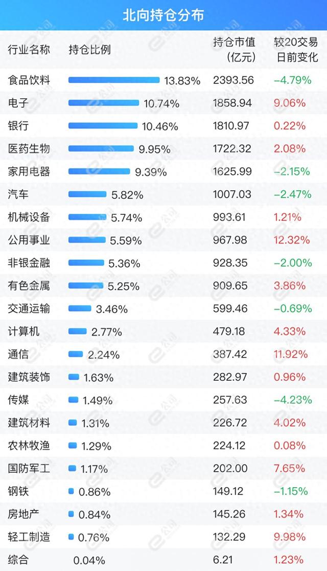 北向资金持仓市值前五行业为食品饮料、电子、银行、医药生物、家用电器,占持仓总市值54.37%。