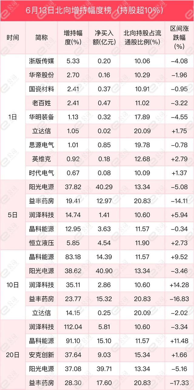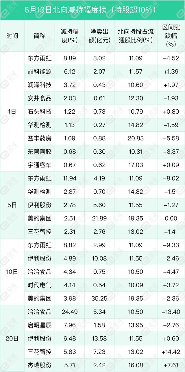 东方雨虹、晶科能源、润泽科技遭北向资金减持幅度居前,分别为8.89%、6.12%、3.72%。