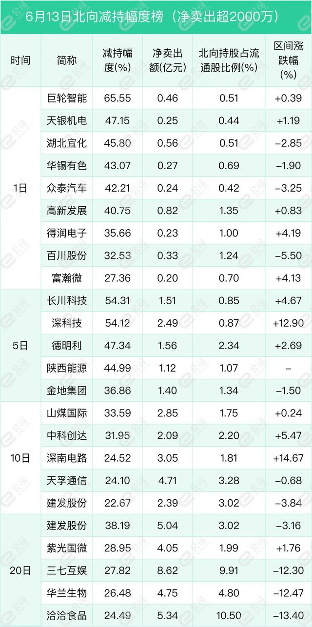 巨轮智能、天银机电、湖北宜化遭北向资金减持幅度居前,分别为65.55%、47.15%、45.8%。