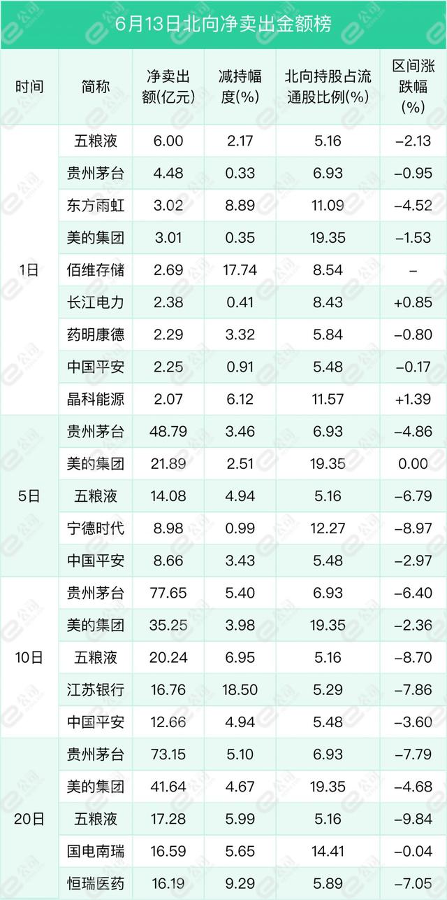 e公司数据统计显示,6月13日北向资金单日净卖出63.04亿元,其中沪股通净卖出21.34亿元,深股通净卖出41.7亿元。北向资金成交金额1296.08亿元,占A股总成交额14.20%,交易活跃度下降0.80%,其中沪股通买入金额310.03亿元,卖出金额331.37亿元,深股通买入金额306.49亿元,卖出金额348.19亿元。