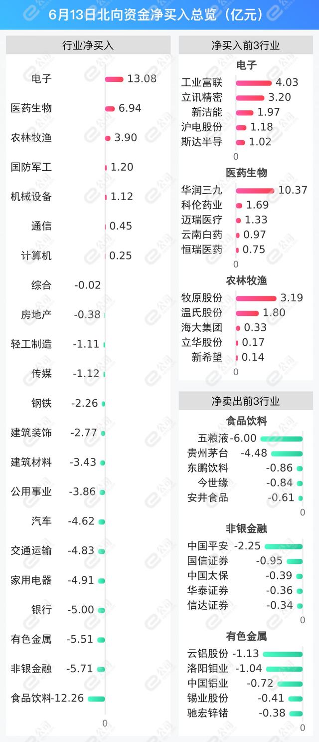电子、医药生物、农林牧渔获北向资金净买入金额居前,分别为13.08亿元、6.94亿元、3.9亿元。