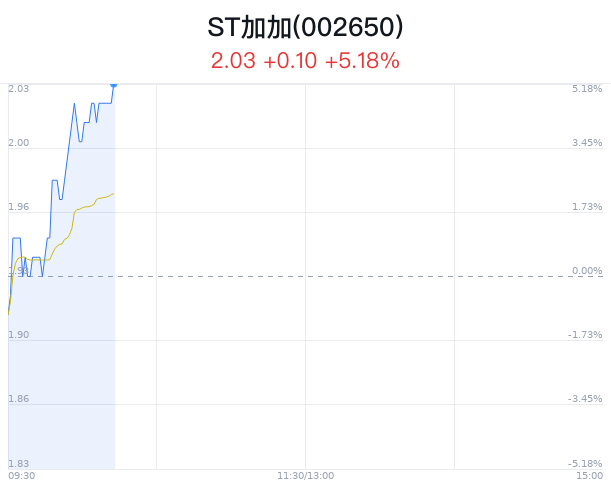 06月18日,ST加加(002650)股价大幅上涨,截至10点12分,ST加加触及涨停,报2.03元/股,成交1158万元,换手率0.51%,振幅6.22%。