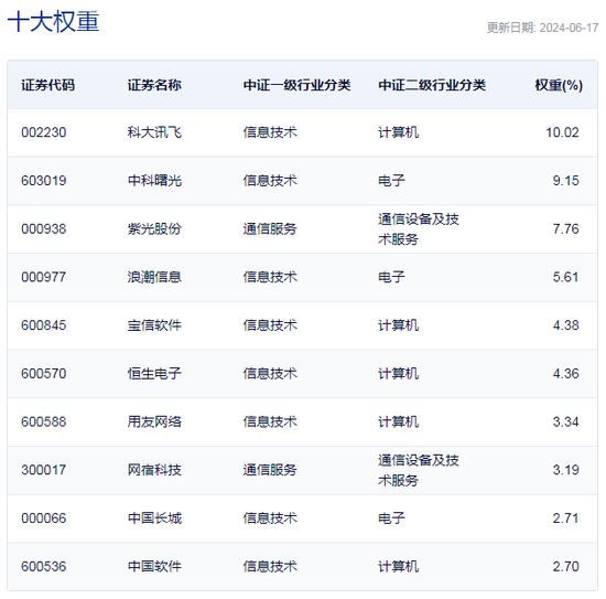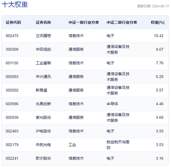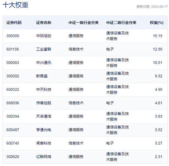中证全指通信设备指数成分股涉及光纤光缆、光器件、光模块等通信设备领域,是一只充分涵盖通信板块主要细分方向的指数。从行业分布来看,通信网络设备及器件、通信线缆及配套、通信终端及配件等行业在指数的行业配置中占据重要角色,前三大行业集中度超60%,呈现高集中度特点。
