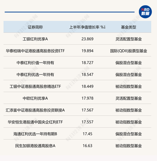 除前述工银红利优享A外,还有中泰红利价值一年、中泰红利优选一年等,这些基金上半年的净值增长率均在18%以上,超越同期沪深300、上证指数等关键宽基。
