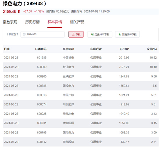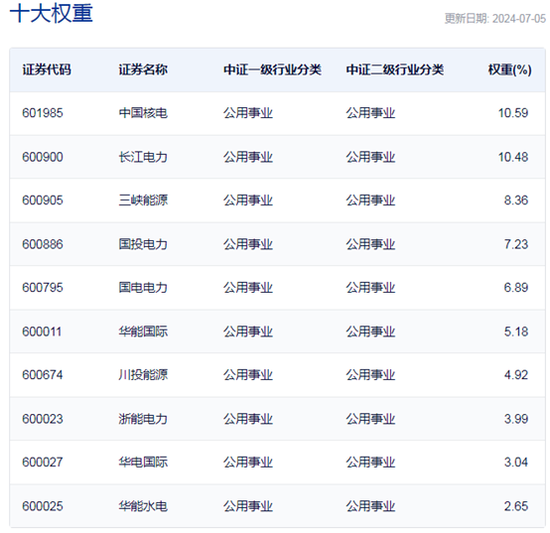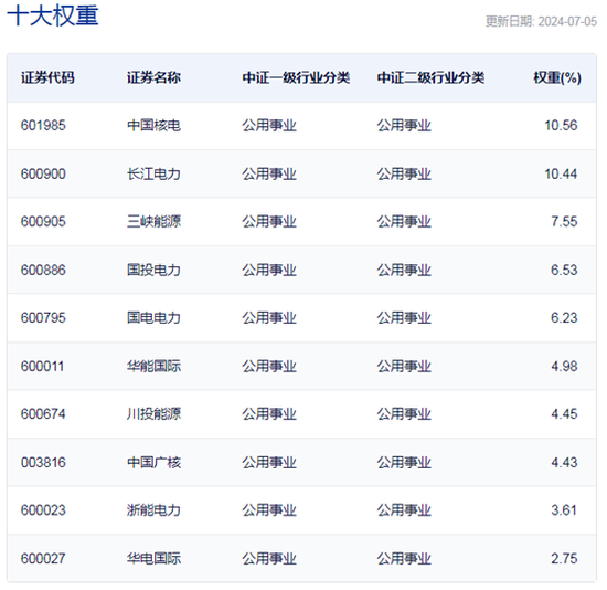 中证全指电力公用事业指数(H30199.CSI)选取中证全指样本股中的电力公用事业行业股票组成,以反映该行业股票的整体表现。该指数成分股主要分布于火电、水电、核电、太阳能等细分行业,前十大权重股占比超50%,持仓集中度较高。