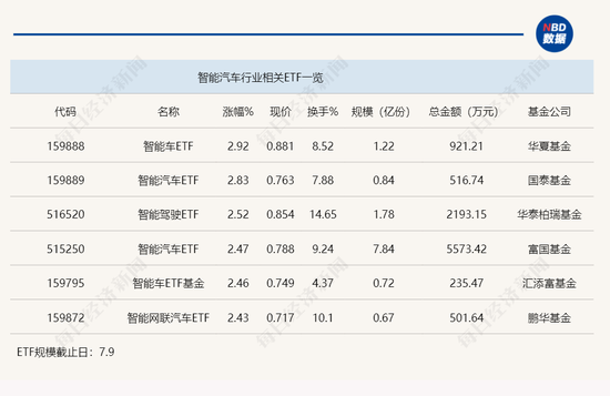 点评:智能车ETF(159888)今日上午涨幅达到2.92%,接近3%,其规模为1.22亿份,半日成交金额为921万元,该ETF追踪的是中证智能汽车主题指数,追踪该指数的ETF还包括智能汽车ETF(159889)、智能驾驶ETF(516520)以及智能汽车ETF(515250)等,其中,智能汽车ETF(515250)规模达到7.84亿份,半日涨幅为2.47%。