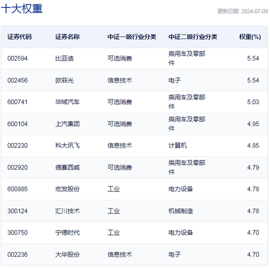 中证智能汽车主题指数主要权重股