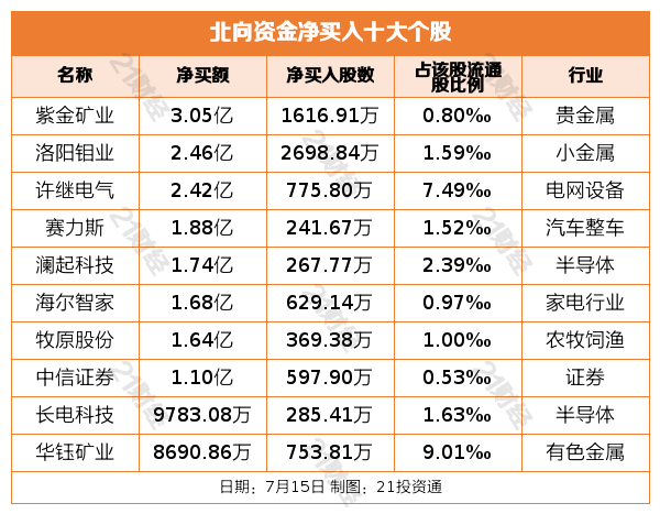 净买入紫金矿业3.05亿元,净卖出京东方A 7.26亿元