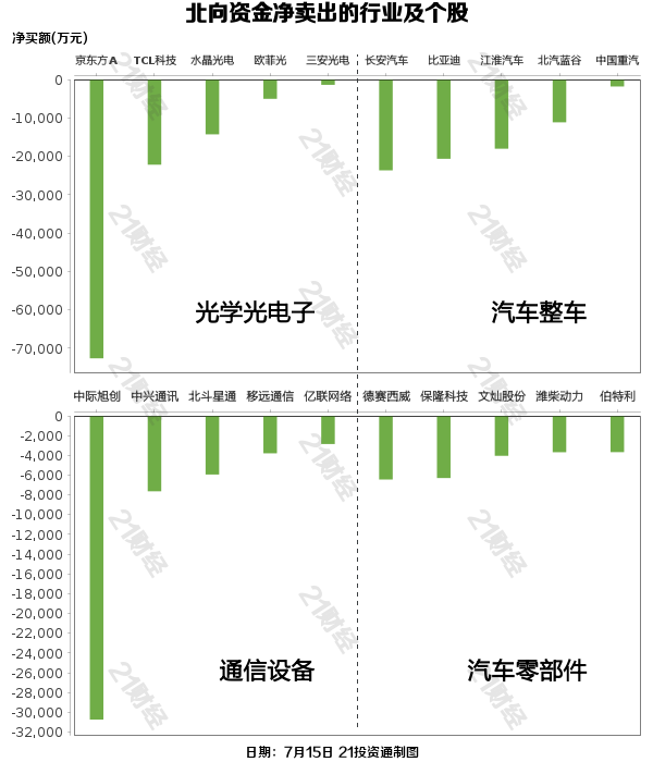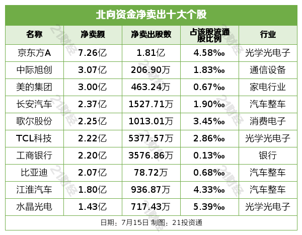 北向资金净卖出京东方A(000725.SZ)、中际旭创(300308.SZ)、美的集团(000333.SZ)、长安汽车(000625.SZ)、歌尔股份(002241.SZ)居前,其中,京东方A被净卖出7.26亿元,中际旭创被净卖出3.07亿元,美的集团被净卖出3.00亿元,长安汽车被净卖出2.37亿元,歌尔股份被净卖出2.25亿元。