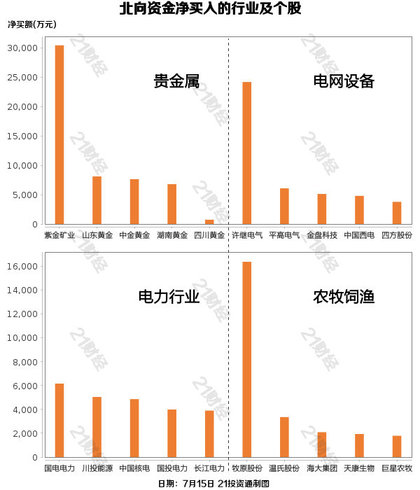 从净买入金额来看,北向资金增持了31个行业,其中贵金属居首,净买入金额达4.89亿元,其次是电网设备行业,净买入4.35亿元。